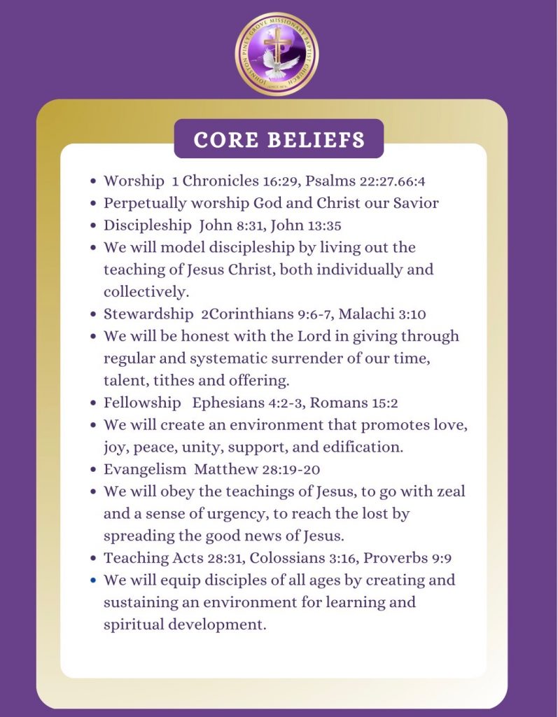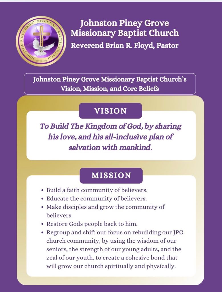Mission, Vision & Core Beliefs The mission, vision, and core beliefs of Johnston Piney Grove Missionary Baptist Church