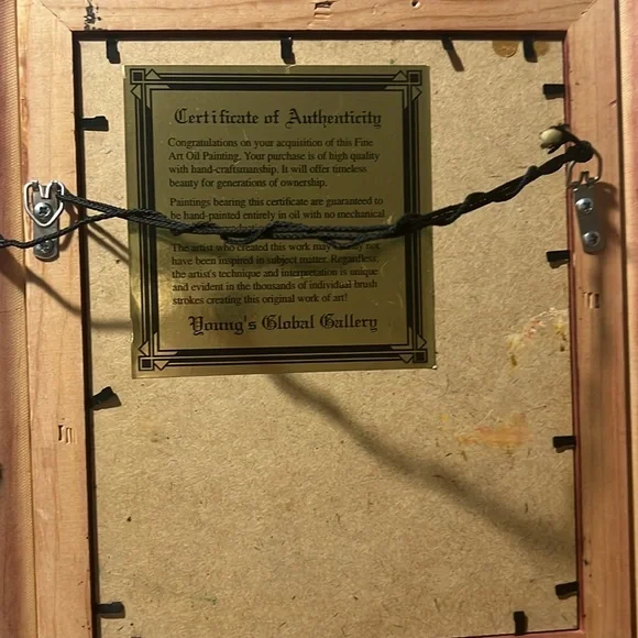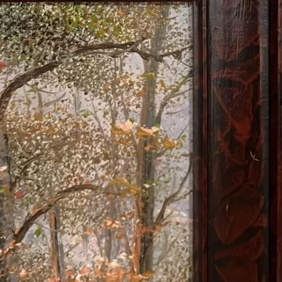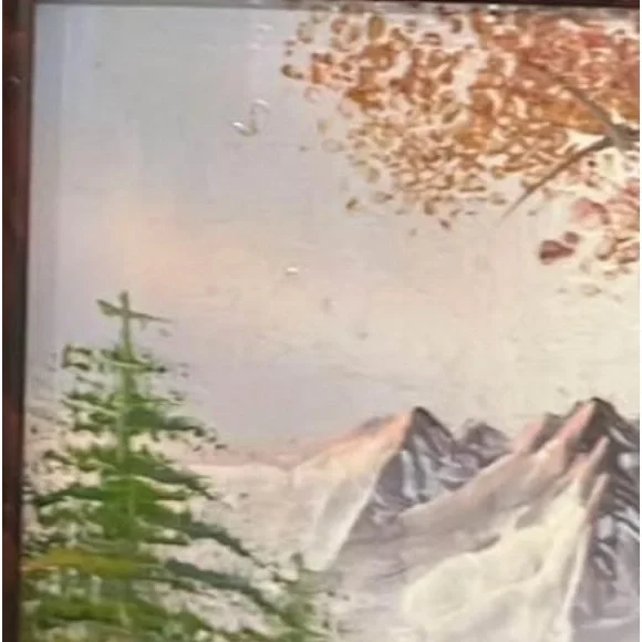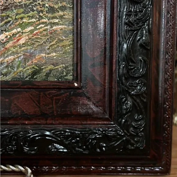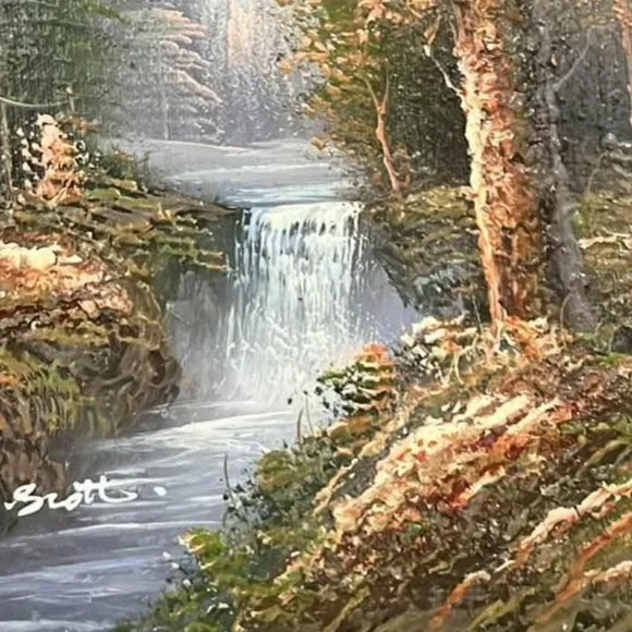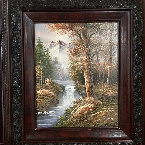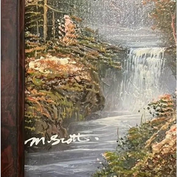 M Scott Mountain Landscape Framed Oil on Canvas in Hand-Carved Mahogany Wood Frame. Depicts Woods, Mountains, Waterfall, Pine tree Forest. Jumps out of the frame: M. Scott has a unique style of 3D etched oil paintings. This is a charming landscape art, to warm up any moment. The subtle colors and veryprecise strokes are a perfect blend to depict a serene landscape of hills through the woods!This is a scene known to be done by M.Scott however many people are selling the unauthenticated versions. This piece has been authenticated by Young’s Globalgallery where it was purchased and is actually one of 500 of the artists actual paintings. Super rare find. Stretched canvas attached to the wood, ready to hang. Certification of Authenticity onback. THIS IS A SUPER RARE COLLECTORS ITEM.The art itself is 8" by 10". With frame it is approx 12" by 14". Excellent condition.