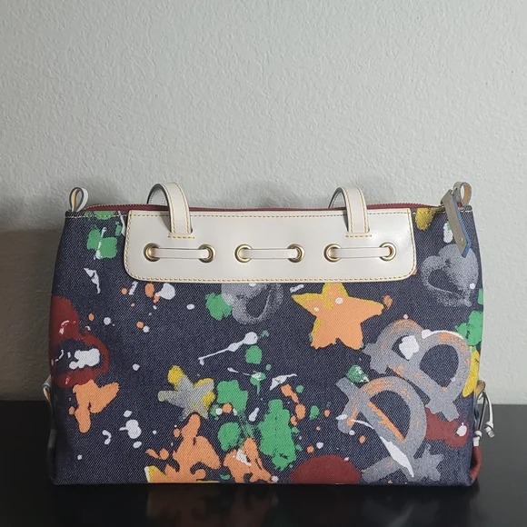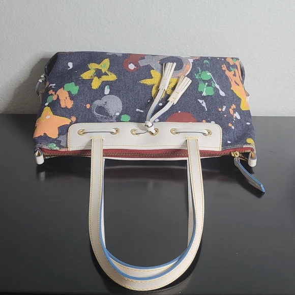 DOONEY & BOURKE Splash Large Tassel Zip Top Blue Denim SplashGreatconditionlooksveryniceandcrispy,possibleneverused. minorbarelynoticeableimperfectionsin randomspotsfromstorage. This Dooney & Bourke zip top purse is a stylish addition to any wardrobe. The blue denim splash pattern adds a pop of color to any outfit, and the tasseled accents give it a unique touch. The purse is made from a combination of canvas and leather, ensuring durability and longevity. Measurementsapproximate 9" × 14" x 4" This purse is perfect for everyday use. It features a zip closure and a spacious interior, making it ideal for carrying all of your essentials. Whether you're running errands or heading out for a night on the town, this purse is a must-have accessory