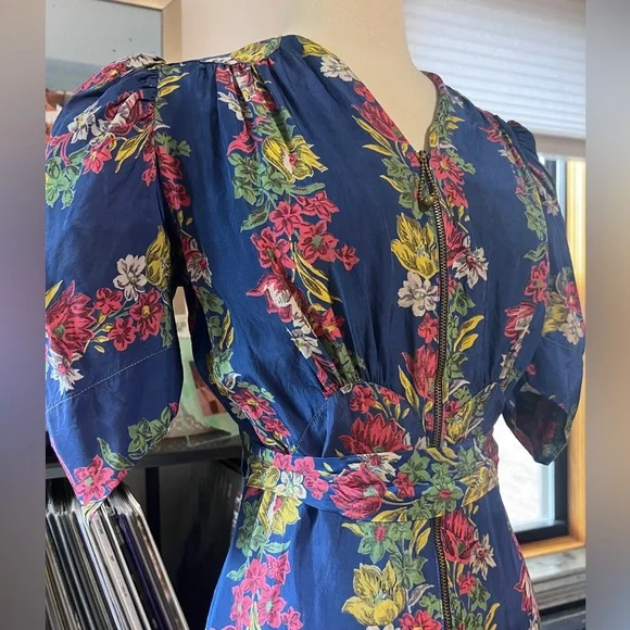 Truly Incredible Elegant 1930s Blue Lilac Floral Dress with the most amazing shoulder puffs. I stuffed them a little for the photos 🥰 . Full front Ball and Chain Talon Zipper. Matching waist tie can be worn with or without, both look lovely. The bottom back of the dress is longer than the front so it gives it a kind of cape like draping. This dress is to die for! Mannequin is a size small. No tags. #floraldress #30sdress #1930sDress #1930s #AntiqueDress