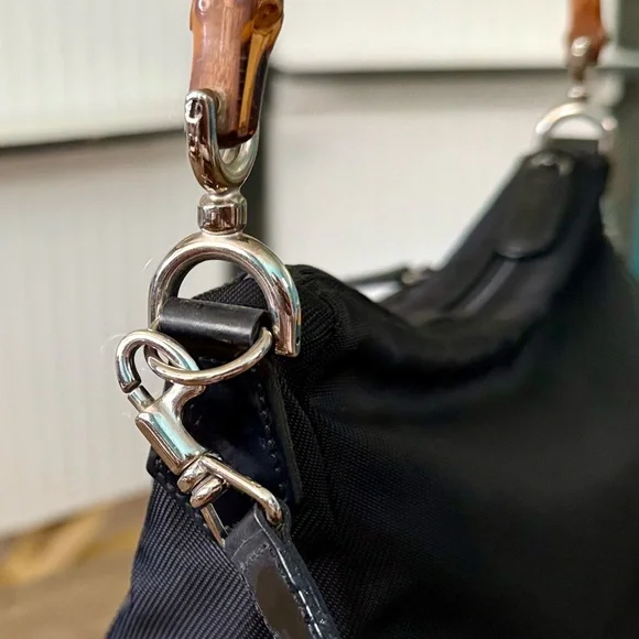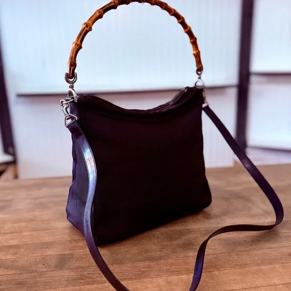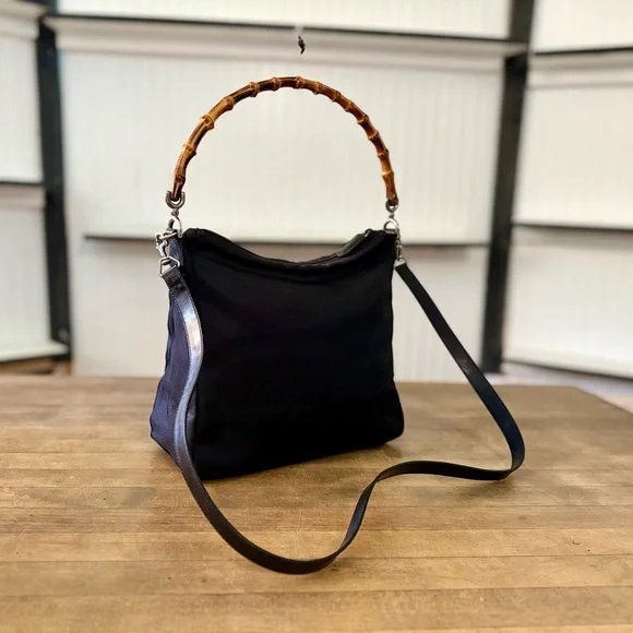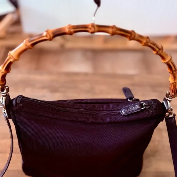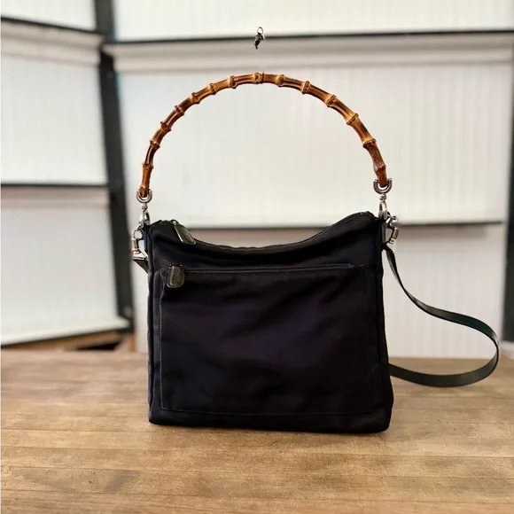 In Immaculate Condition and absolutely gorgeous describes this Gucci Vintage Black Nylon Bamboo Top Handle Crossbody Bag Purse.Measures: 10” H x 12” W x 5” D.Bamboo Handle Drop: 6” Crossbody Drop: 19.5”Gucci Bamboo Top Handle Crossbody Bag Purse•Vintage Black Nylon •Silver-Tone Hardware•Bamboo Single Handle •Single Shoulder Strap•Genuine Leather Base & Strap•Single Exterior Zippered Pocket•Single Interior Pocket•Logo Jacquard Lining•Zip Top Closure with Leather Gucci Pulls Call outs: Minor surface scratches at base, otherwise this is in PRISTINE Condition!