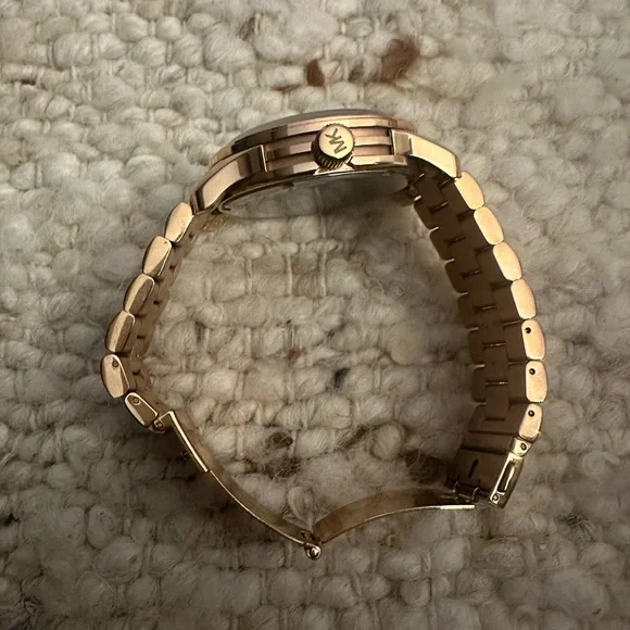 Comes with box/pillow, booklet and extra links. Worn only 10 times or so. Battery needs to be replaced. Rose gold-tone stainless steel case and bracelet. Fixed rose gold-tone bezel. Blue dial with rose gold-tone hands and index hour markers. Minute markers around the outer rim. Dial Type: Analog. Date display between 4 and 5 o'clock positions. Quartz movement. Scratch resistant mineral crystal. Solid case back. Case diameter: 45 mm. Case thickness: 14 mm. Round case shape. Band width: 24 mm.Band Material: Stainless SteelBand Width: 24 mmBand Color: Rose GoldFace Color: Blue