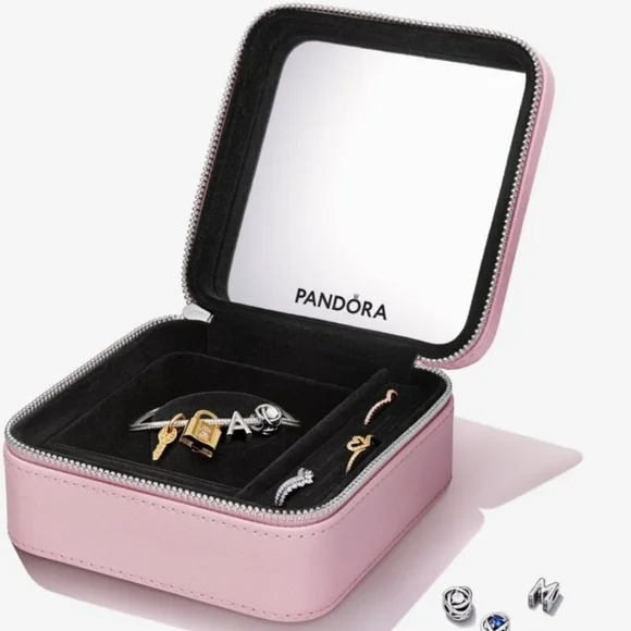 Brand new in its box. Really beautiful for either to have on your vanity or luxurious travel.Introducing the perfect travel case for all your summer getaways! Our thoughtfully designed Jewelry Box allows you to stay organized, while protecting your favorite pieces with the various velvet-lined compartments and removable insert. Perfect for your favorite bracelets, charms, rings, earrings & necklaces. It’s the perfect size for travel and provides enough space to mix & match items during your vacation. Zipper on the box to lock your jewelry and mirror inside the lid is handy for putting together your look each day. Jewelry not included.