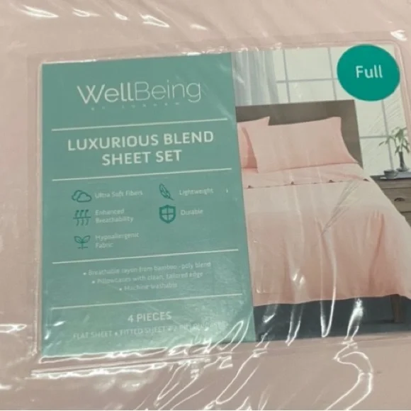Product DetailsAdd breathable comfort to any bedroom with the LuxuriousBlend sheet set from WellBeing by Sunham, featuring asolid ground design.• Set includes: fitted sheet (54" x 76" x 15"), one flatsheet (83" x 96"), two pillowcases (20" × 30")Fabric: rayon/polyesterMachine washableImportedWeb ID: 14504526