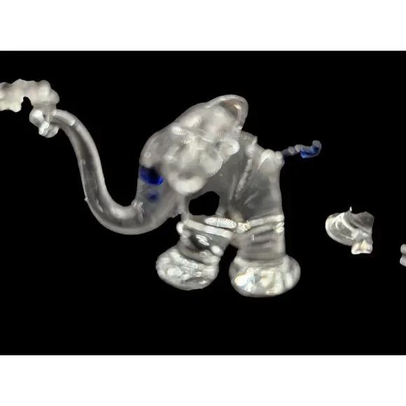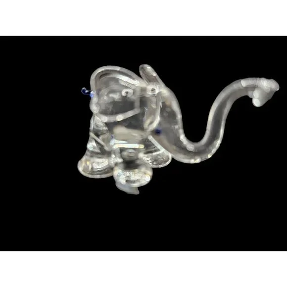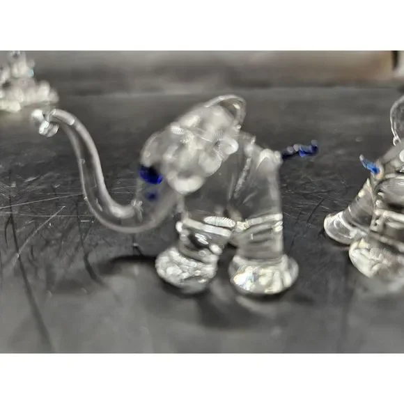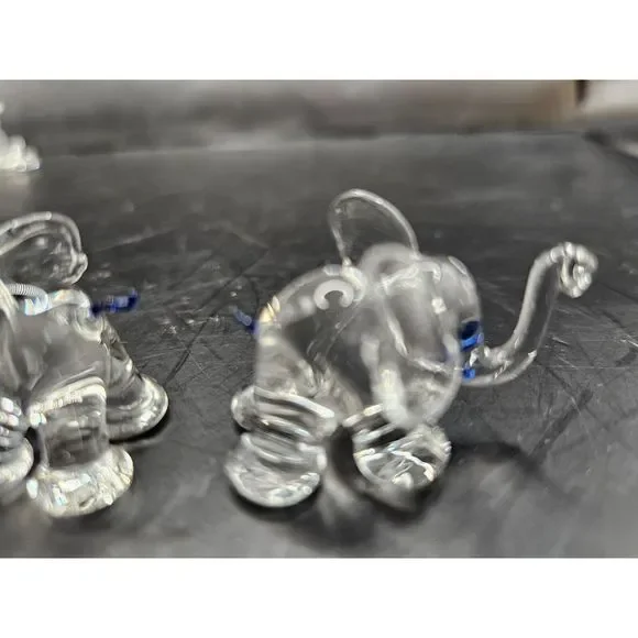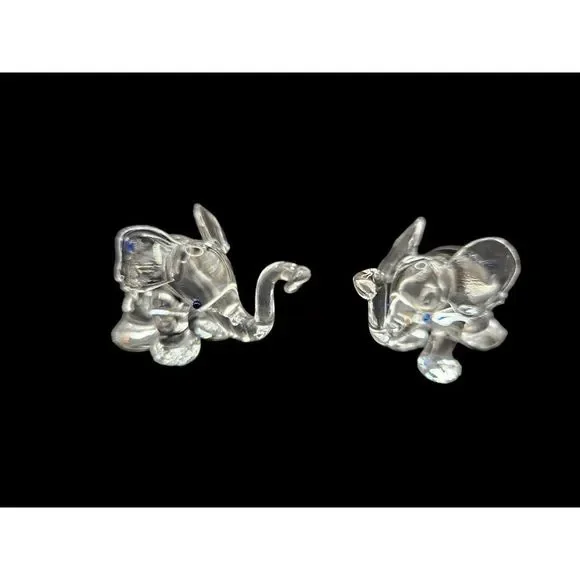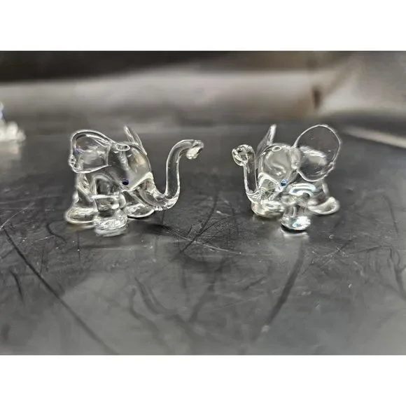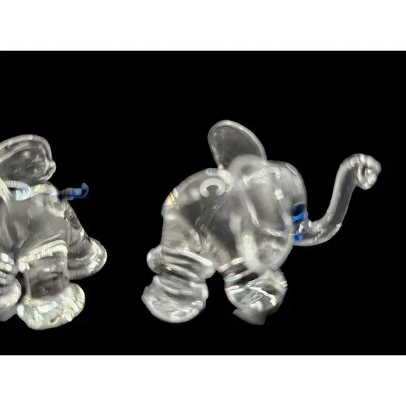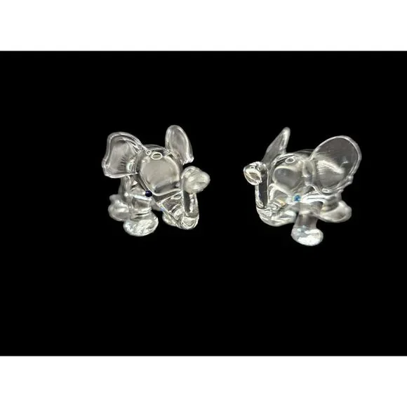 This exquisite pair of miniature crystal elephants will add a touch of elegance to any collection. Crafted with exquisite detail, these elephants boast impressive blue eyes and charmingly curled tails. The material used in their creation ensures a stunning translucency that will catch the light and capture your heart.Perfect for collectors of all ages, these elephants are a must-have for any animal lover. Whether you're an avid collector or simply looking for a stunning addition to your home decor, these crystal elephants are sure to impress. Don't miss out on the chance to own these beautiful figurines today.