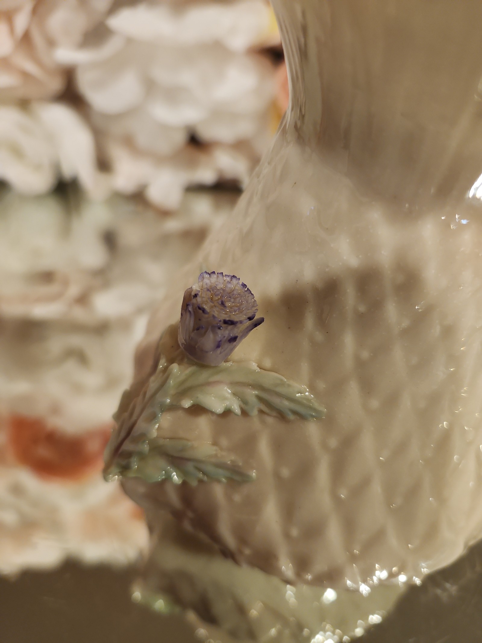Vintage Belleek Porcelain Lavender Thistle Vase, Diamond Pattern Irish Fine China, Collectible. Embossed diamond quilt vase in ivory colored porcelain has a jagged flared opening and is decorated on each side with delicate lavender thistle and green foliage.