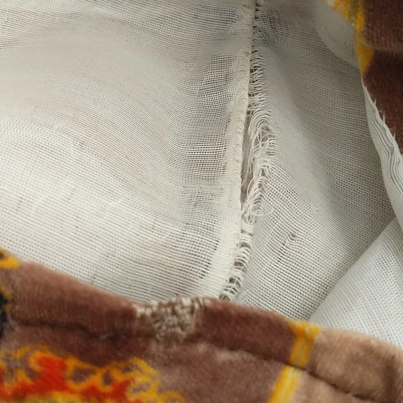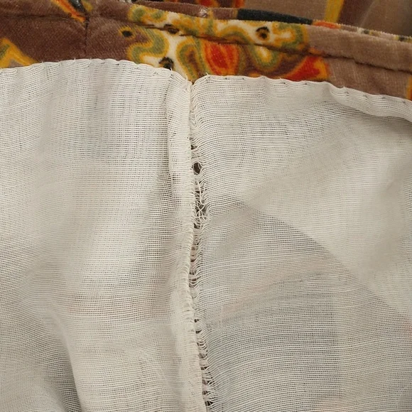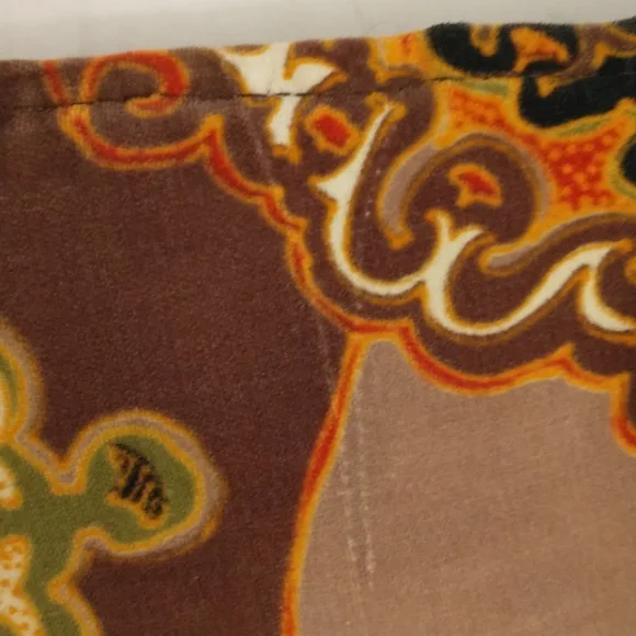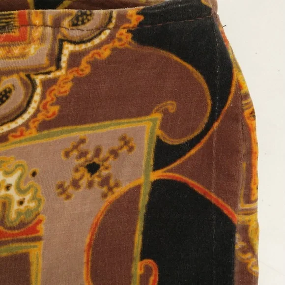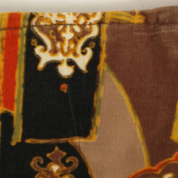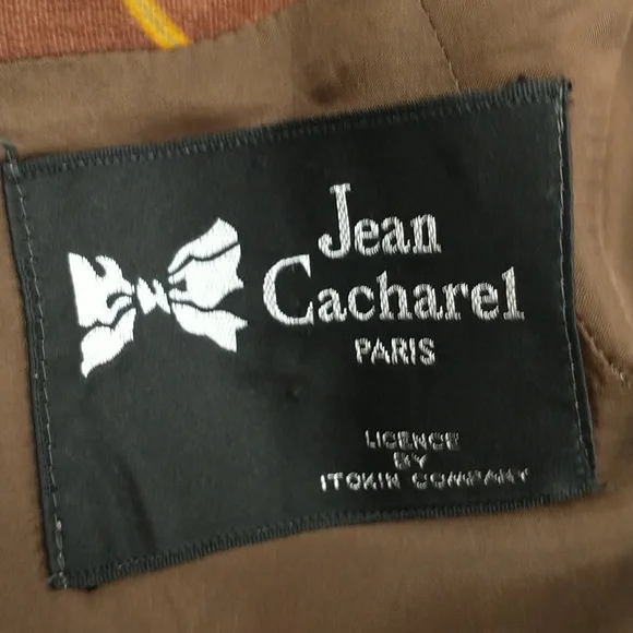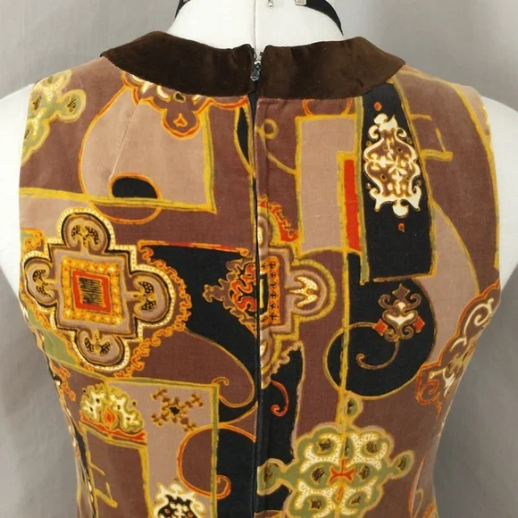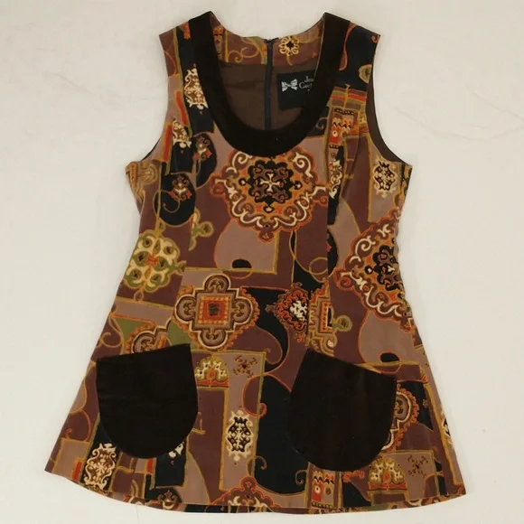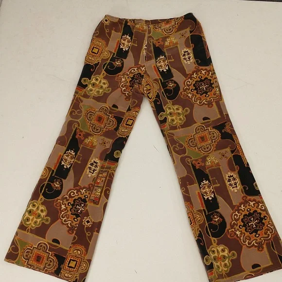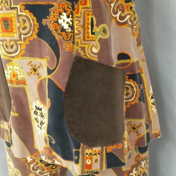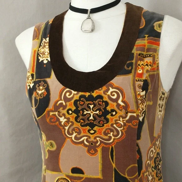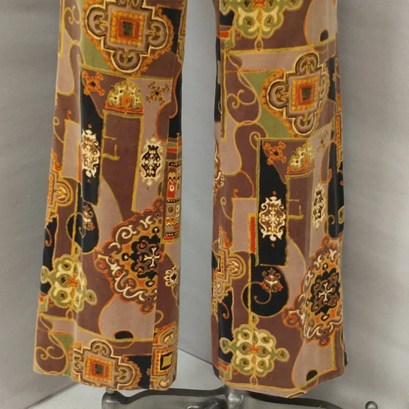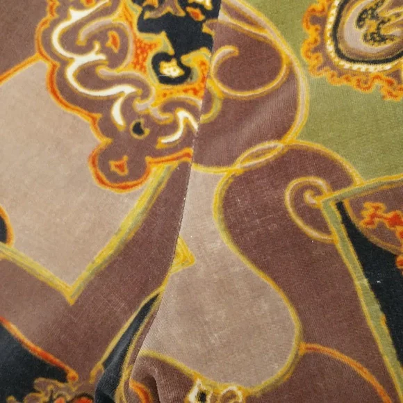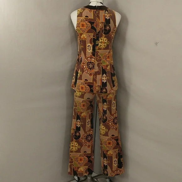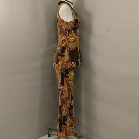 Fun authentic velvet pant suit by Jean Cacharel Paris. Circa seventies. Upscale Mod styling, right on target for the period. Brown palette with black, tan, orange, gold and muted green. Top lined in brown, pants in white. No size tags. Shown on a 6 dress form and pants would not zip, contemporary equivalent apx. 6 top and 4 pants. Please go by measurements for fit. Tunic top -Pit to pit 17.5", waist 28.5", hips 40 ". Pants - waist to hem 37", rise 12.5", inseam 28", hips 38", waist 28". Overall condition good. The pants have darts that have been let out, a small darned spot at waist edge, light wear rear velvet, stretch seams on lining. Clean, great looking and ready to wear. Designer glam.